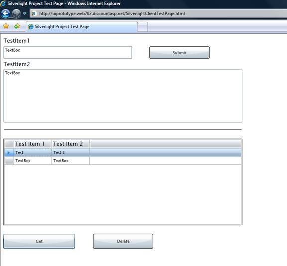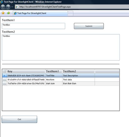 - Fill in the OnSubmitBtnClick and OnGetBtnClick as shown below. Create a call back to handle the GetRowsCompleted event. (By the way, are you noticing how easy this is? Look at how much is getting done with a few lines of code and look how clean and sensible these few lines are.)