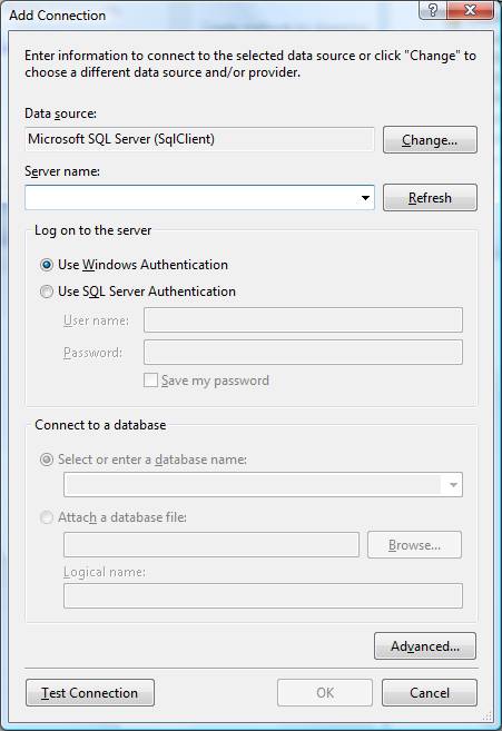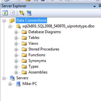 - If you set up your server at the beginning of the project you will already have a database in the server explorer view as I do (in my case it's named sql2k801.SQL2008_540970). If you haven't, click on the cylinder with a plus sign icon under Server Explorer to connect to database.