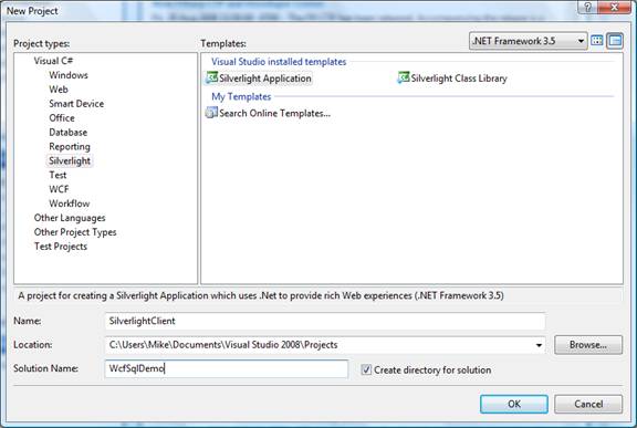 - Create a new SilverlightApplication called SilverlightClient. Call the solution WcfSqlDemo.