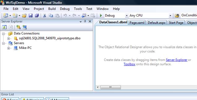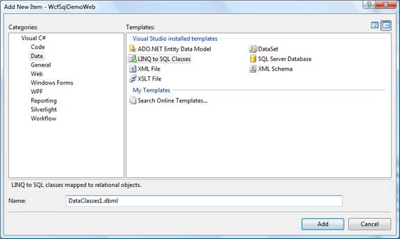- Right click on WcfSqlDemoWeb and select add, new item. Select Data, LINQ to SQL Classes, and leave the name DataClasses1.dbml