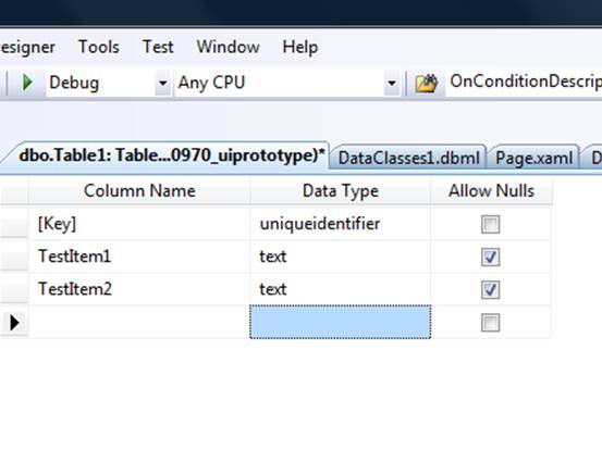 - Right click "Table" on your connected database and select add new table. Fill in table as shown below. Under properties name the table DemoTable.