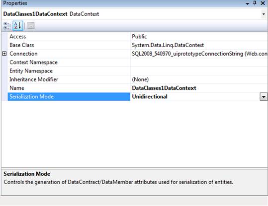 - View properties for DataClasses1.dml. Set the serialization mode to unidirectional so that it is compatible with web services.