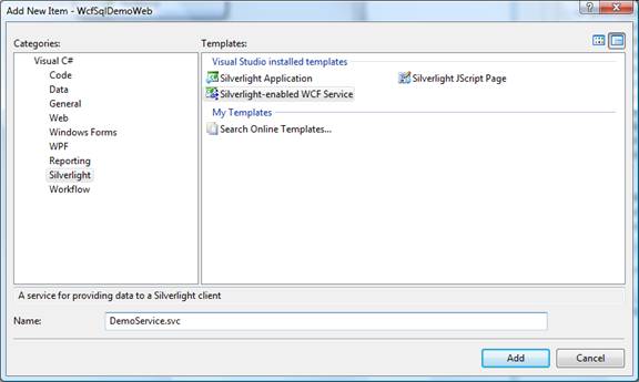 - Okay, that takes care of your database. Now let's set up the web service. Right click on the WcfSqlDemoWeb project and add a new item. Select the Silverlight-enabled WCF Service template and name it DemoService.svc
