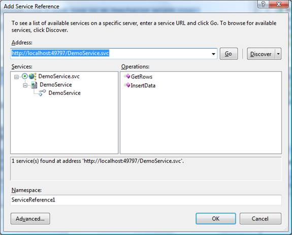 - Now we need to let our Silverlight client know about the web service we've just created. Right click SilverlightClient and select Add Service Reference. Click Discover. VS2008 should find the service from the project. Allow it to be saved in the namespace ServiceReference1.