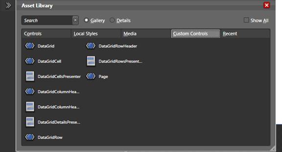 - Now you can go to the asset library and find DataGrid under Custom Controls.