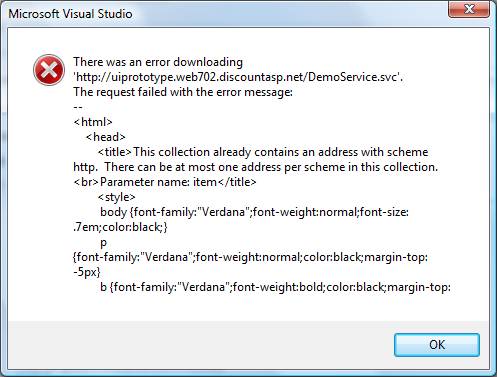 - To see the difficulty, publish the website. Now DemoService is located at your server right? All you might think you need to do is reconfigure your silverlight client to reference the service at your website. Go ahead and try it. Right click on ServiceReference1 and select Configure service reference. Add the address of the service. In my case it is http://uiprototype.web702.discountasp.net/DemoService.svc. You'll get the error below and you won’t be able to proceed.