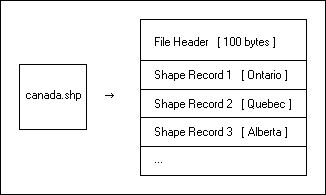 The main file (with a .SHP extension) is the primary component and its structure begins with a fixed-length, 100-byte header containing information about the total length of the file, the file version, and the type of shapes it contains. This file header is then followed by a list of variable-length records, with each record defining the geometry for a single ESRI shape. An ESRI shape might be a polygon that represents the political boundary of a country, a polyline that represents the path of a city street, or a point object that indicates the location of a city. The figure below illustrates the format of a .SHP file.