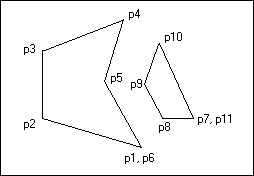 Now, there are some interesting details concerning the mapping of an ESRI shape record to a WPF shape. For example, an ESRI shape record with ShapeType equal to ShapeType.Polygon may actually be composed of more than one polygon. Consider a shape record representing the state boundary of Hawaii as an example. Since Hawaii is made up of several islands, multiple polygons are needed to represent the state. The shapefile format handles this using the concept of a "part". A part can be thought of as a connected series of points. You will see later that an ESRI part maps very well to the WPF concept of a "figure". If you go back to the definition of the ShapeFileRecord class shown earlier, you'll see a collection property, Parts, which holds a set of indices for the corresponding Points collection. Each value in the Parts collection is an index into the Points collection and identifies the starting point of a part. To illustrate this visually, consider a shape record that consists of two polygons (or parts) as shown below.