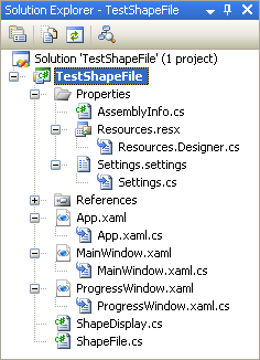 The demo project (TestShapeFile) is a standalone WPF application that I created using VS 2005. On my system, I have installed the November 2006 CTP release of the WCF/WPF extensions for VS 2005, and the Windows SDK for Vista. The screenshot below shows how the Visual Studio project is organized. I ran the project through FxCop 1.35 as well, so the code should be fairly conformant from that respect.
