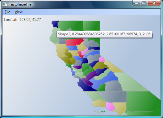 Every WPF shape that is created is given a unique name, such as "Shape28". If the associated shape record has attributes as well, the first five attribute values are formatted into a tooltip string for that shape. The screenshot below shows a map of California with a tooltip being displayed for one of the census regions (shapefile source: U.S. Census Bureau).