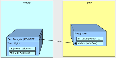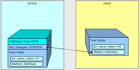 Step 3: AddOne() is removed from the stack and MyInt is boxed (copied) to the heap. Del now points to the heap version of the object.