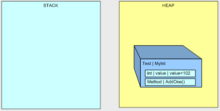 Step 4: AddOne() is called from the boxed object, updating it's value to 102.