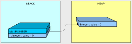 Step 2: i is copied to the heap (boxed) and obj goes on the stack, the value of obj is the memory address of the new object on the heap (a pointer).
