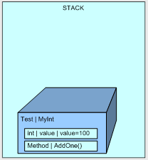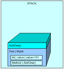 Step 2: AddOne() is placed on the stack and executed. Changing the value of MyInt.value to 101;