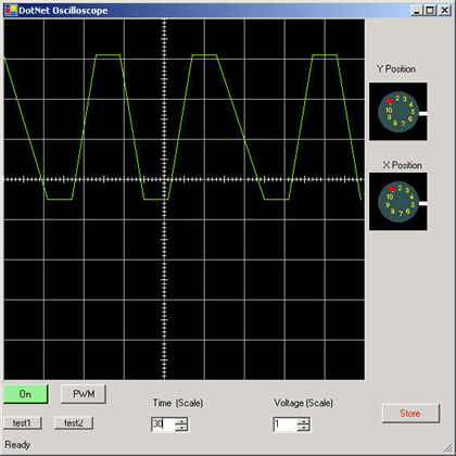 The .NET scope is a simple storage scope that allows to scale both time and voltage. There are also two knobs on the side of the scope (created from the volume control in a previous article) that allow you translate the horizontal and vertical position of the signal. The oscilloscope has two modes: continuous and storage. You can store a particular trace simply by hitting the Store Button. After a trace is stored you can also adjust its position and scale using all the available knobs and controls. You can return to continuous mode by hitting the store button again.