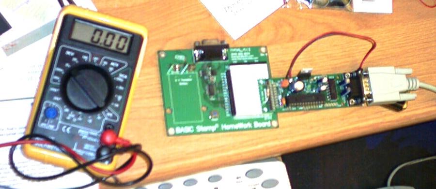 As with any kit, there is one slight catch. You have to put it together. The GP-3 Board requires some minimum soldering skills, in which admittedly I was a little rusty. Also a general knowledge of electronics is helpful, although not completely necessary. The board is fairly easy to assemble, and AWC guides you on every detail. It also gives you helpful hints on how to test each individual subassembly on the board including the power supply circuit, the serial port circuit, and the PIC microcontroller circuit. There are relatively few parts, and it shouldn't take you more than a few hours to assemble the full board(longer if you put one of the parts in backwards, like I did ;-) . Below is the final assembly after barely soldering all the parts without burning my fingers off (Never give a soldering iron to a computer programmer). The GP-3 is the board that is hooked to the serial port on the right. The long integrated circuit on the GP-3 board in figure 2 is the PIC16F873A microcontroller that we can program from the PC.