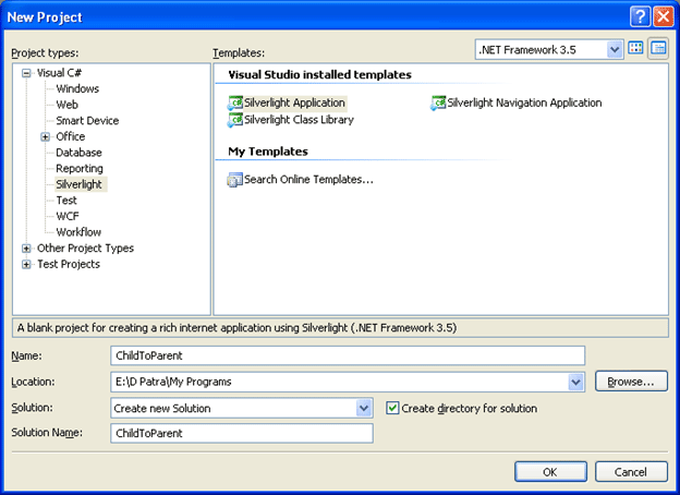 Fire up Visual Studio 2008 and create a new Silverlight 3 Project. Name it as ChildToParent.
