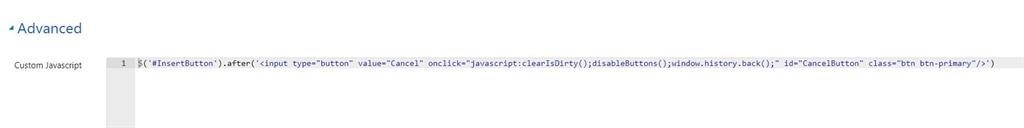 - $('#InsertButton').after('<input type="button" value="Cancel" onclick="javascript:clearIsDirty();disableButtons();window.history.back();" id="CancelButton" class="btn btn-primary"/>')