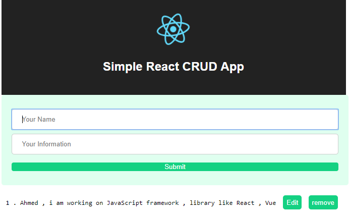- <form ref="myform" className="myForm"> <input type="text" ref="name" placeholder="Your Name" className="formfield" /> <input type="text" ref="address" placeholder="Your Information" className="formfield" /> <button onClick={this.fSubmit} className="myButton"> Submit</button> </form>