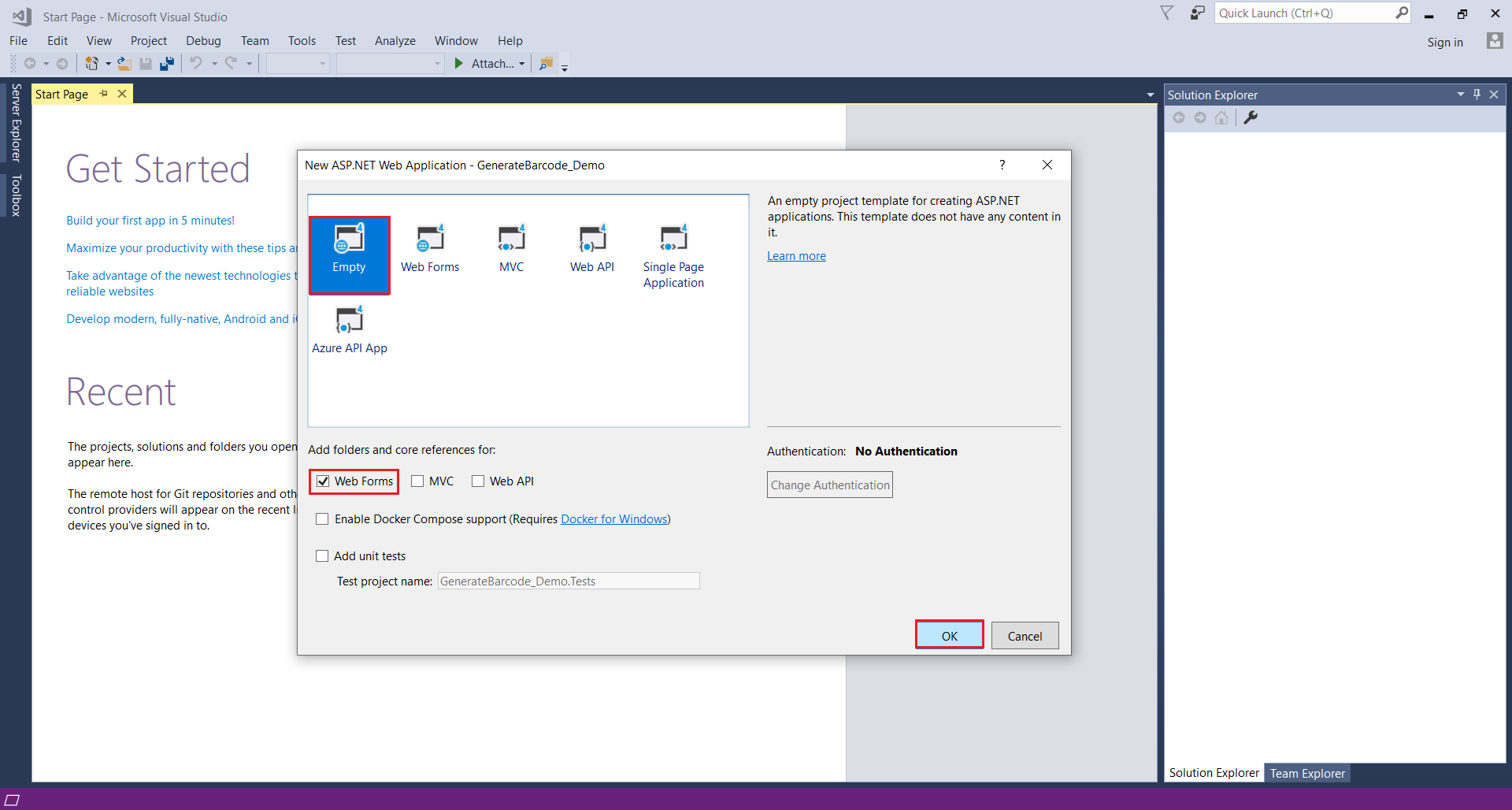 Select “Web” from the right panel then select ASP.NET Web Application (.NET Framework). Enter the project name. I am giving GenerateBarcode_Demo. You can give anything you wish to, and select the file path in the appropriate text box. I am choosing default, and selecting the required Dot net Framework, as in the screenshot below. Then, click the “OK” button, as in the screenshot below.