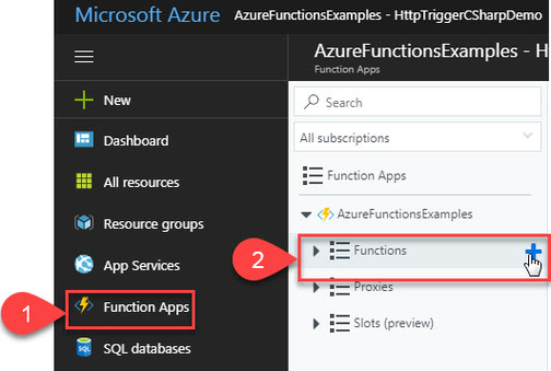 Click Function Apps->AzureFunctionsExamples (which you have created) -> Functions -> “+” to create new function.