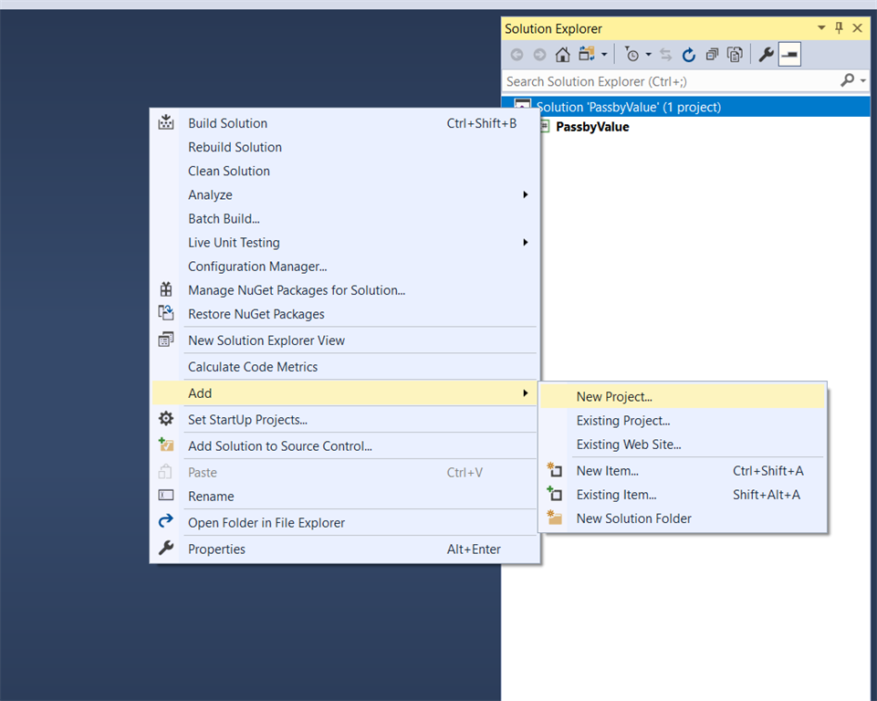 Select the Console Application with proper solution name and project name (like PassbyValue)