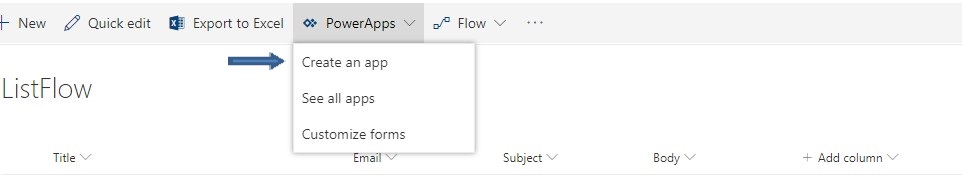 - For creating Power Apps please click on “PowerApps” from ribbon and then click on “Create an app”