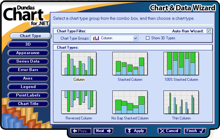 I immediately decided to create one of those cool 3-D Charts like I see in the ads in MSDN. So I chose the 3D button and selected a Clustered Series graph as in Figure 4. I then chose Appearance and changed my bars to transparent. Finally I added a chart title.