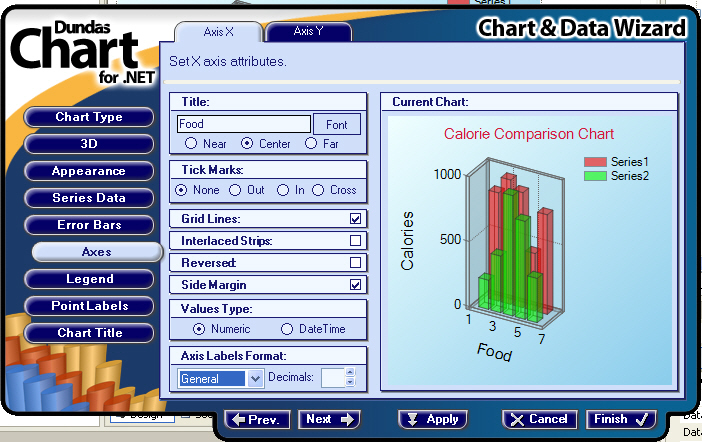 Fortunately there is a way to do this which I found through the extensive Dundas Chart Help integrated into Visual Studio. I can actually associate a label with a data point. In the case of a bar chart, this is exactly what I need to do to accomplish applying labels for different foods right on the x axis. Listing 1 shows the code I used to chart each food and the corresponding calorie content: