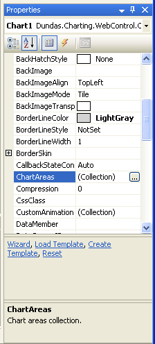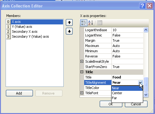 For example, if we wanted to change the position of the Food x-axis label, we could go into the Property Window and first choose the ChartAreas Collection as shown in Figure 8.