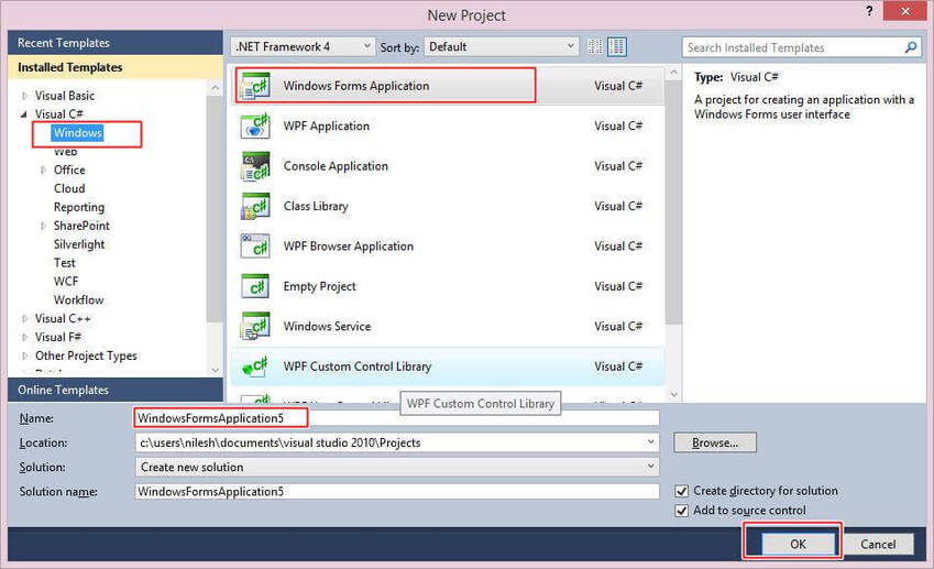 Open Visual Studio 2010, go to File, New, then Projects. Under Visual C#, click Windows. Select Windows Forms Application.