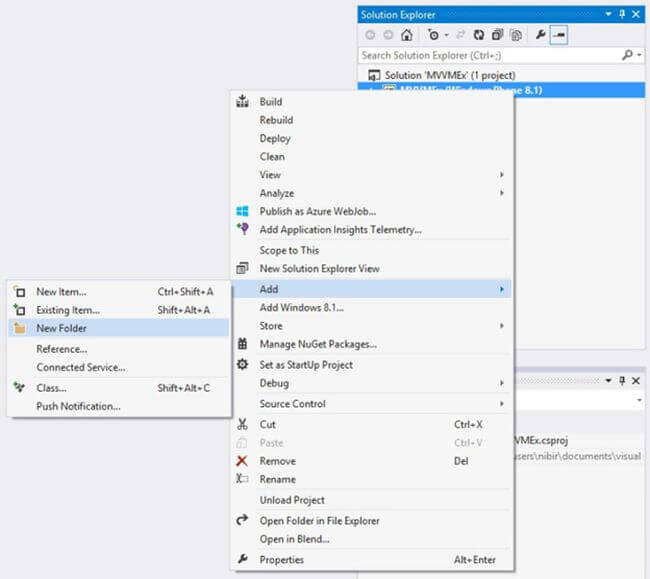 First of all, open up a new project and name it “MVVMEx” or whatever you want. Now, simply delete your “Mainpage.xaml”. Don't freak out, it's a way to do the modification. Now, add the three folders “Models”, “ViewModels” and “Views” one by one, like this.