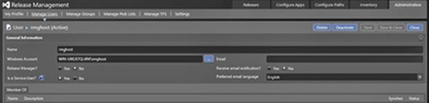Create the RM server shadow account as a new user in the RM client and grant both “Service User” and “Release Manager” permissions. In the following screen, the Release Manager should be "Yes".