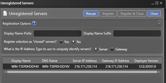 A pop-up will be displayed with unregistered server details. Your newly configured server should display in that list and you can register that server by double-clicking on it or click the register button, as shown in the following screen.
