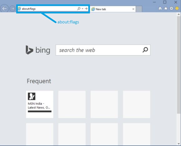 Launch IE 11 and type about: flags in the address bar then press the Enter key.