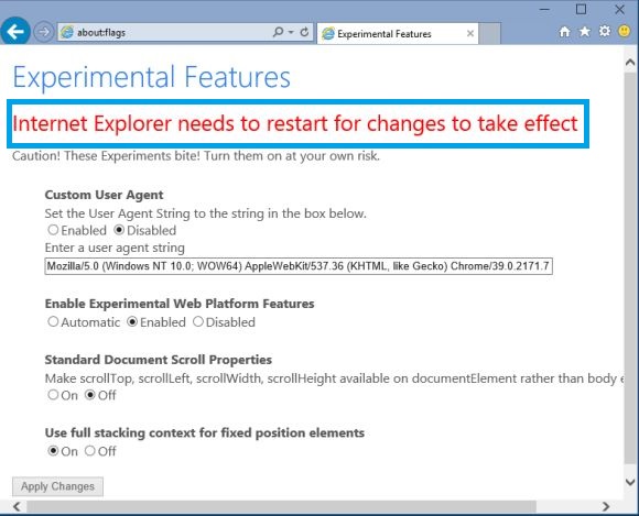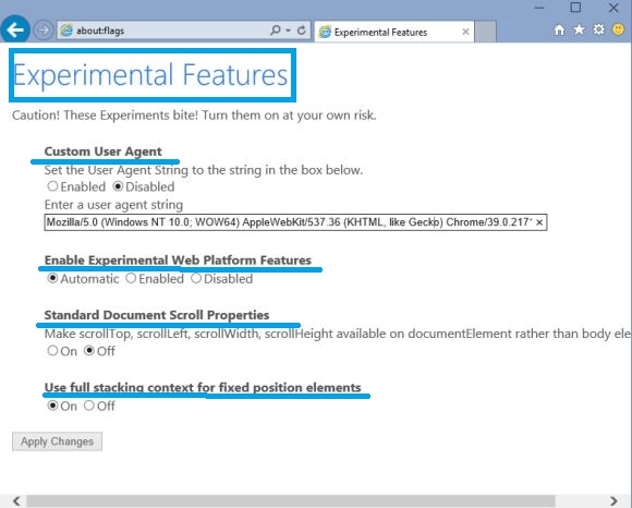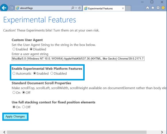 Move to Enable Experimental Web Platform Features and select the radio button labeled Enabled. Click the Apply Changes button.