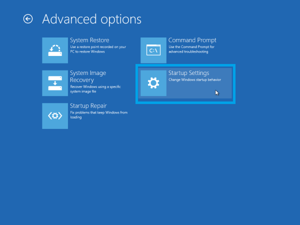 Click on the Advanced Options and then a screen with more options will appear. Then click on the Startup Settings option.