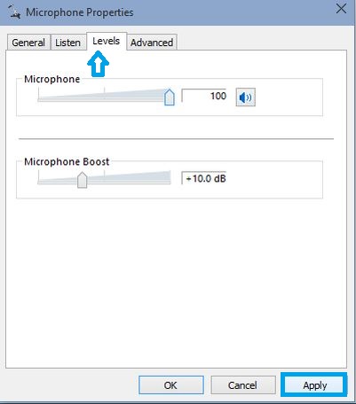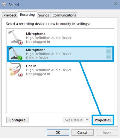 Test your microphone to check the sound meter. If you want to change the level of the sound, click Properties before that to ensure that the microphone is selected.