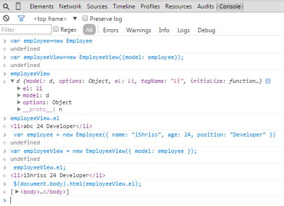 el defines the view for the object. By default it is an empty div. It refers to the HTML element, by which we can access the HTML element and its properties. All views have DOM elements. this.el can be created from an id, className, tagName and attributes properties. Let us use an example as in the following: