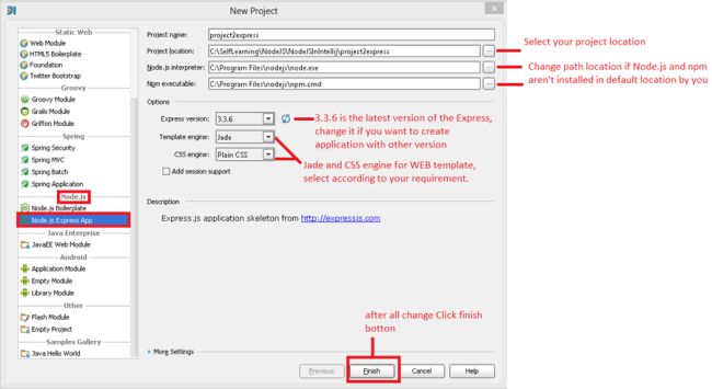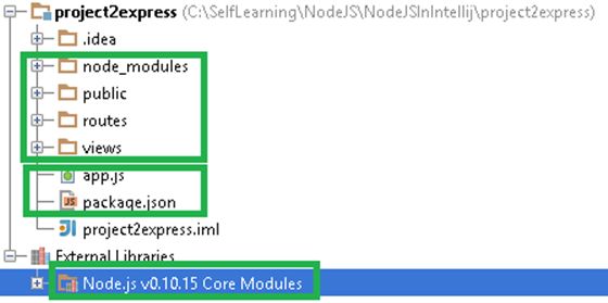 Several months ago I began working in Node JS. It is a really good language that supports event models at the language level. Node JS is a wrapper written around Google's V8 JavaScript engine that allows JavaScript to be run outside the browser. It optimizes JavaScript for working outside of the browser. This article is all about how to start working with Node JS and how to design web applications using an Express module. There are many IDEs available in the market for writing Node JS code. I have used Intellij IDEA in this article. So let's start reading this article and understand the Express framework. I assume that you have already installed Node in your machine; if not then install it from here.Click here if you want to configure node node in intellij IDEA Let's start creating an Express project; Express is a framework that allows the creation of the MVC web architecture in a Node JS application. There are many ways to create an Express project but in this article I will use Intellij IDEA to create a node Express project. 1. Create Express projectOpen Intellij IDE and create a new project as in the following: Click on the Finish button and intellij will start downloading the required modules and files for your Express project. Click the "Configure" button to include the node core library in your project. This core library will help you to enable intelligence when writing node code. Finally our Express project is ready with its predefined structure. An Express project contains many folders and files. The above structure isn't very hard to understand, let's drill down it.