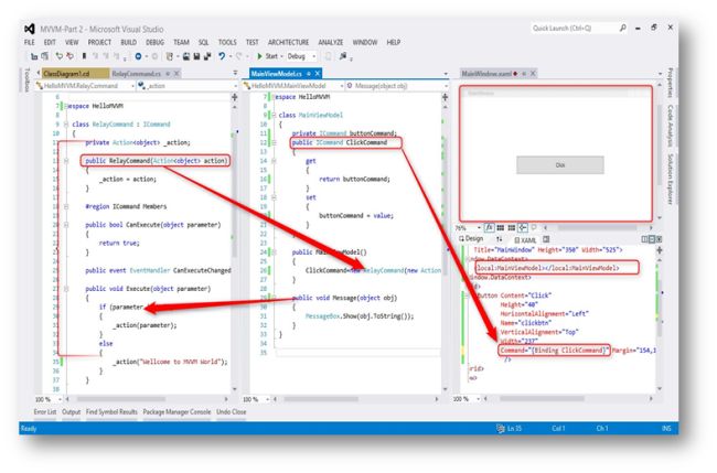 In the preceding images I show how Icommand binds to a View and how to call RelayCommand in a View-model. The following describes that procedure: