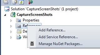 We are using the Screen class of Windows Forms to get our requirement that contains the many methods related to screenshots, so we need to add the reference for Windows Forms in our project. To add a reference, right-click on the project as in the following: