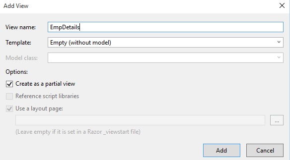 Now call the partial view EmpDetails in Main Index view as in the following code