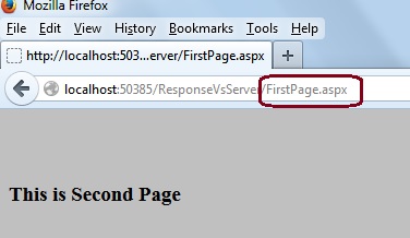 In the preceding example we redirected the page using Server.Transfer. Then the page is not permanently redirected on the second page, but it processes the second page on a first page. As we clearly see, the URL is not changed but still it is on the first page and it shows the output of the second page on the first page.