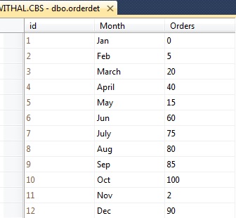 Now before creating the application, let us create a table named orderdet in a database from where we show the records in a chart, the table has the following script (shown in the following image):