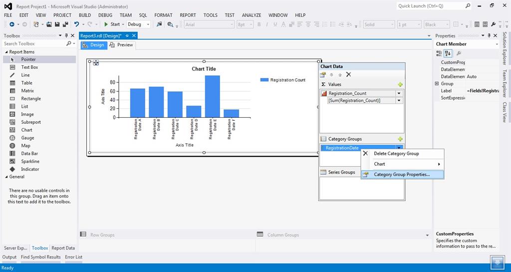 Here, in our database the RegistrationDate column format is "yyyy-MM-dd" and also it contains time. In our report we do not need to show this time part. To change the Registration Date format right-click on Registration Date in the Category Group and click on the Category Group Properties.