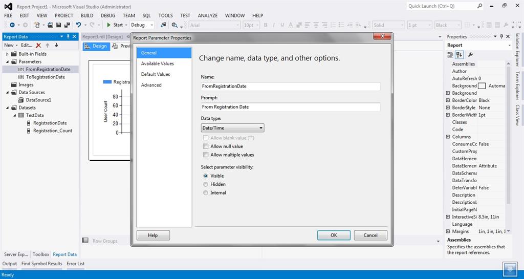 So here we are ready with our Report Design. Here for this report we are passing date parameters so we will set the data type Date/Time for both parameters, FromRegistrationDate and ToRegistratioinDate. To set the data type of the parameter, go to the View menu then select Report Data. In that in the Parameters section double-click on Parameter. You will see a Report Parameter Properties window. In that select the data type from the drop down list and click on OK. Here we are passing a date so I am selecting Date/Time.