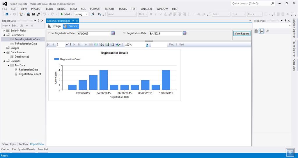 Now, click on the Preview to see the report output. You will see a report preview with two parameters. Select the From Registration Date and To Registratioin Date using a Date Picker and click on the View Report button.