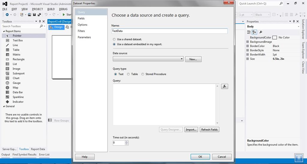 Now, you will see a Dataset Properties window. Enter the Dataset Name TestData. We will use a Dataset embedded in the report so select the option "Use a dataset embedded in my report".