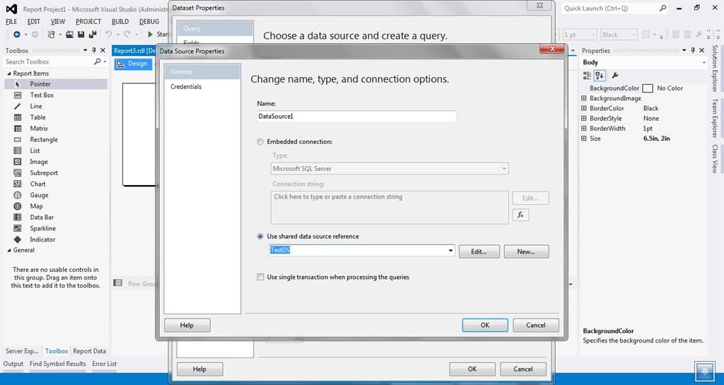 To set the Data Source click on the New Button. You will see the "Data Source Properties" window. Select the "Use shared data source reference" option and select a data source name from the available drop down list. Here it is TestDS. Click on the OK button.